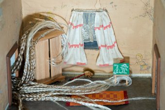 Ici, elle se fond dans une maison de poupée qui a d’abord été construite par nos arrière-arrière-grands-parents, continuée par nos grands-parents, et terminée par notre père. Masantu et moi avons meublé la maison de poupée avec des objets qui ont été transmis de génération en génération, y compris une horloge faite à la main par mon arrière-grand-mère. Cet acte symbolise la légitimité de son envie de faire partie de la mémoire générationnelle de ma famille, malgré les objections éventuelles de certains. En réalité, mon arrière-grand-mère, qui n’a jamais eu la chance de rencontrer ma sœur, a également adopté un orphelin pendant la Seconde Guerre mondiale.